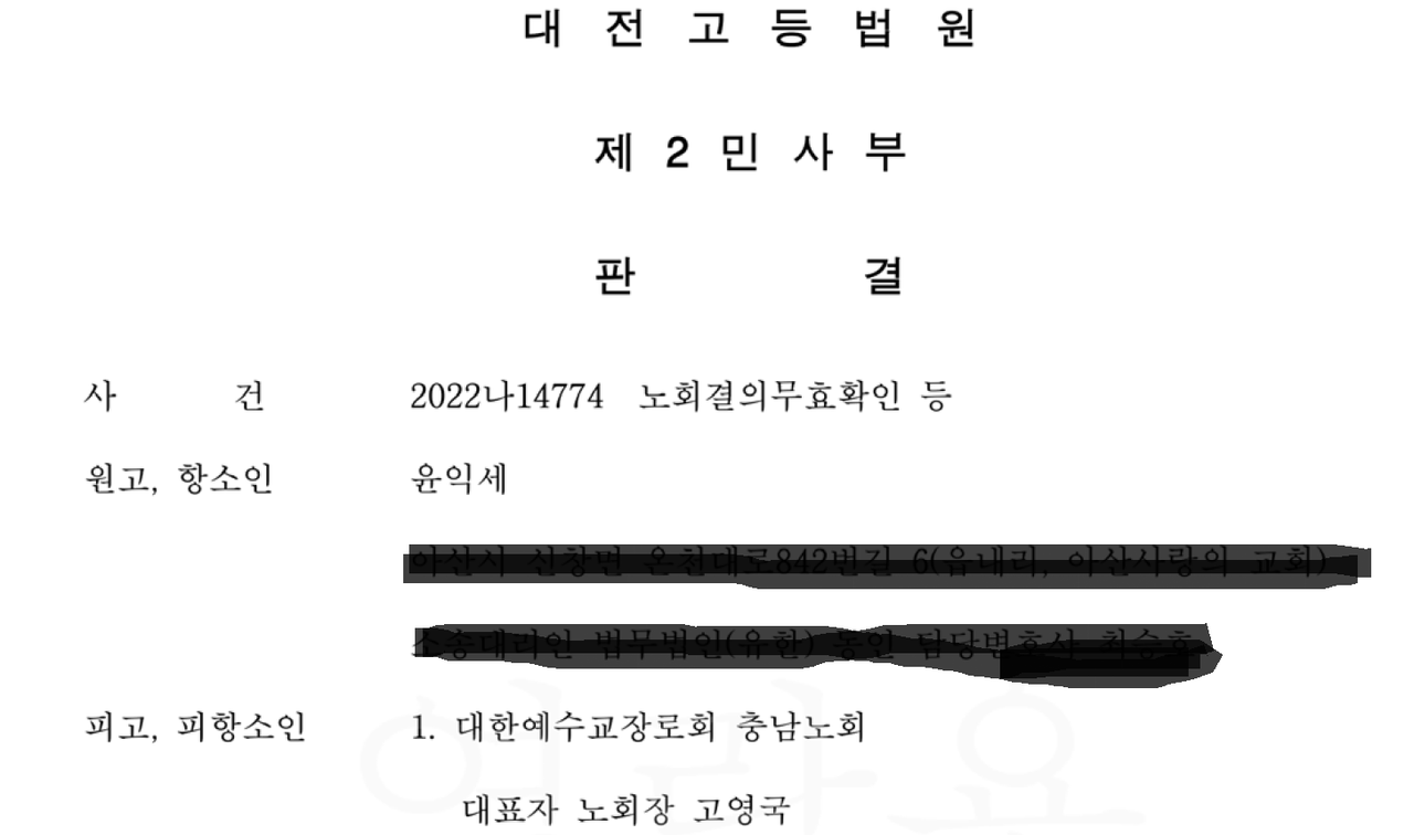지난 8월 31일 대전고등법원 2022나14774 (정기회) 노회결의 무효확인 등 소송 항소심 판결선고에서 원고 윤익세의 항소가 기각되었다.