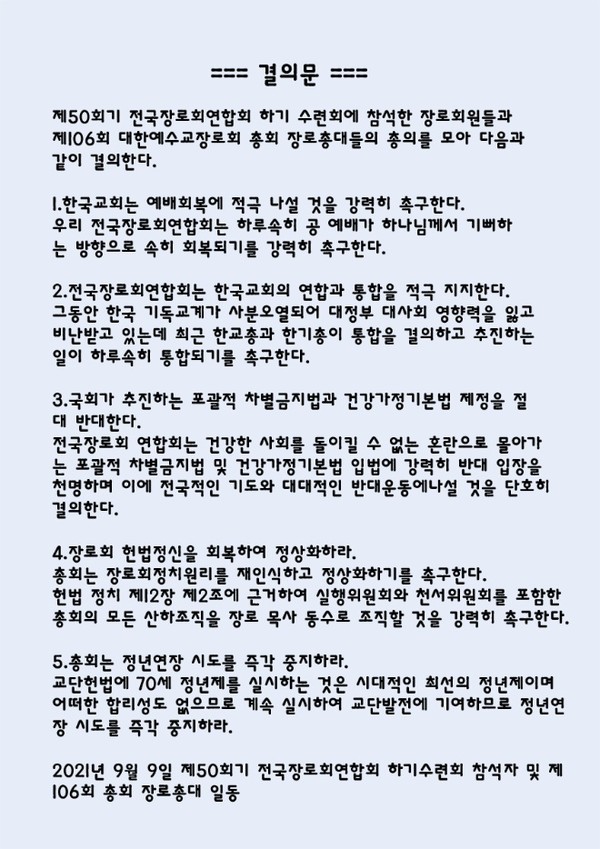 ▶ 정년연장 시도 반대하는 총대장로 일동 결의문 채택