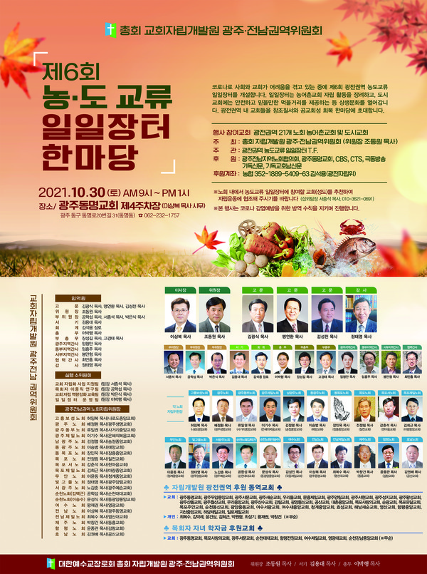지난 10월 1일, 총회교회자립개발원 광주전남권역위원회(위원장:조동원 목사)는 광주서문교회에서 임원회를 열었다. 이번 임원회에서는 제6차 도농일일장터를 10월 30일 오전 9시부터 오후 1시까지 광주동명교회(이상복 목사)에서 개최하기로 결의했다. 도농일일장터 수행을 위해서 소위원회(위원장 서종석 목사)로 일임시켰다.